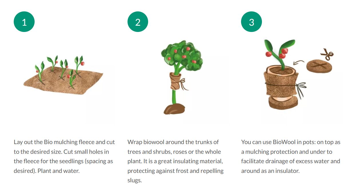 BIO vlna je 100 % vyrobená z prírodnej ovčej vlny a je šetrná k životnému prostrediu. Zabraňuje rastu buriny, obohacuje pôdu o živiny a zlepšuje vegetáciu. Môže sa použiť v ekologických plantážach, zeleninových a domácich záhradách. Tiež účinne chráni kmene stromov a kríky pred chladom a vetrom a môže sa použiť na kvetináče ako izolačný materiál. Dá sa strihať a upravovať do ľubovoľného potrebného tvaru a veľkosti.