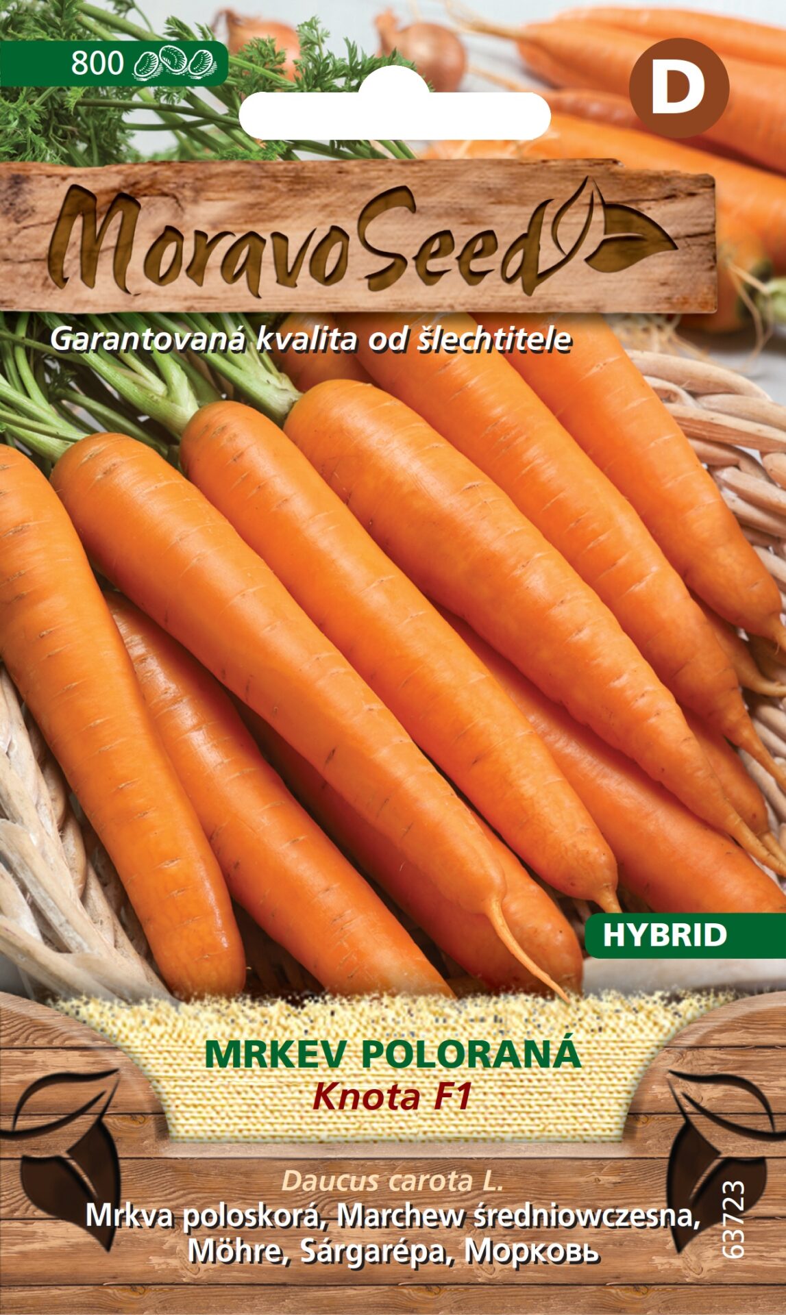 Mrkva KNOTA F1 je kvalitná odroda mrkva, vhodná na pestovanie v záhrade aj na poli. Poloraný hybrid typ nantézské mrkvi, má valcovité korene s tupým zakončením, dĺžka 18-20 cm, hlava koreňa nezelená a nemá antokyanové zafarbenie, vysoko odolný proti alternatívnej škvrnitosti listov a proti praskaniu koreňov.