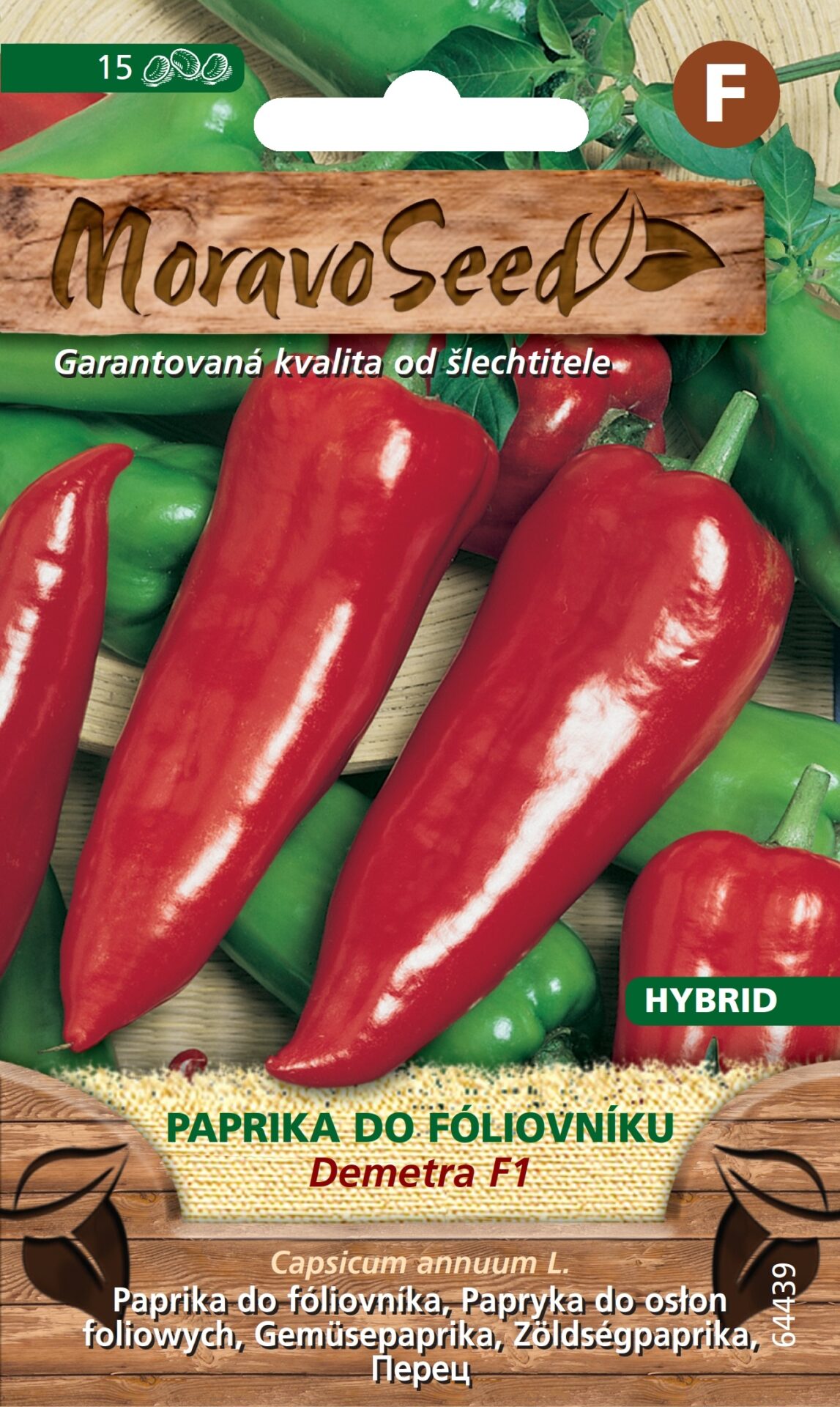 Paprika ročná DEMETRA F1 je kvalitná odroda paprika rocna, vhodná na pestovanie v záhrade aj na poli. Veľmi výnosná hybridná odroda s dlhými trojuholníkovitými plodmi.